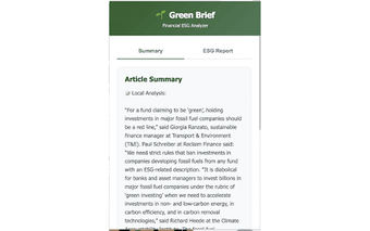Green Brief är en kostnadsfri webbläsartillägg som fungerar på Chrome och erbjuder användare en AI-driven assistent för att analysera finansiella artiklar och bloggar. Med fokus på att generera sammanfattningar och ESG-rapporter, hjälper verktyget användare att snabbt förstå komplex information genom kortfattade sammanfattningar. Funktioner som Smart Summaries gör att långa artiklar blir mer lättillgängliga, vilket sparar tid och underlättar beslut.
